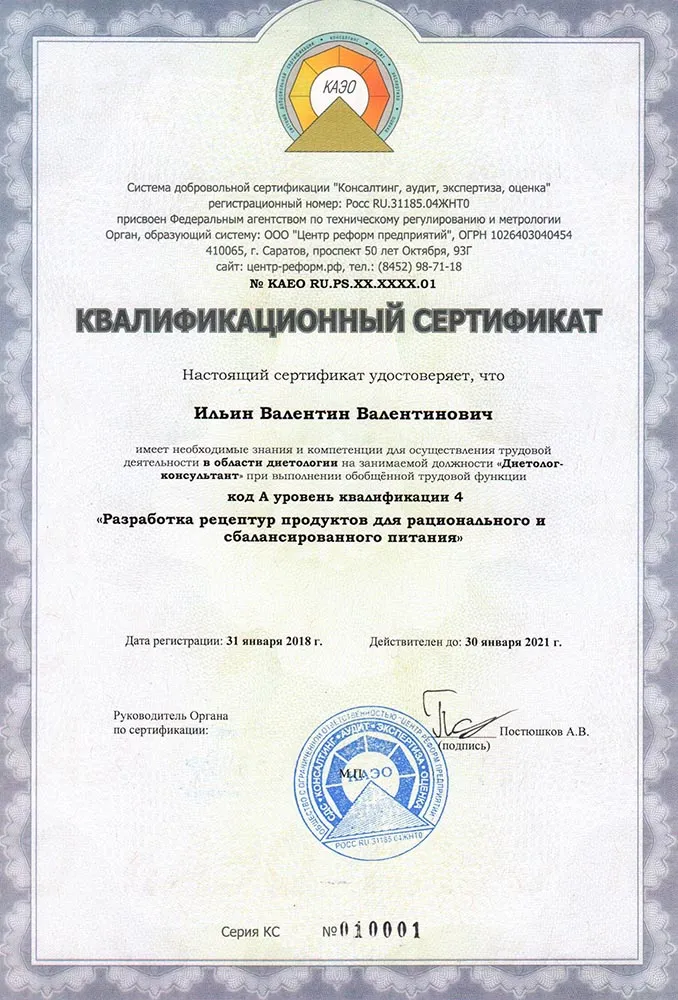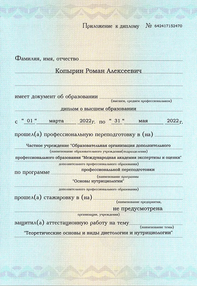 Диплом о профессиональной переподготовке установленного образца и квалификационный сертификат соответствия Профессиональным стандартам.